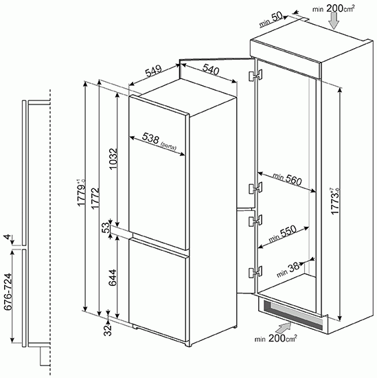 Хладилник с фризер за вграждане 280л - SMEG C7280NLD2P