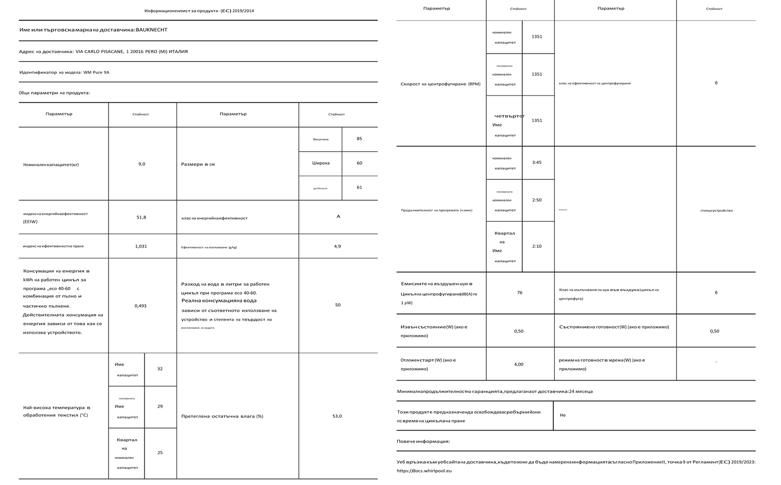 • ЕНЕРГИЕН ЕТИКЕТ - BAUKNECHT WMPURE9A